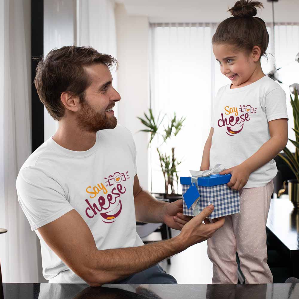 A father and his daughter can flaunt their relationship by wearing matching Jopo's Dad and Daughter "Say Cheese" t-shirts.